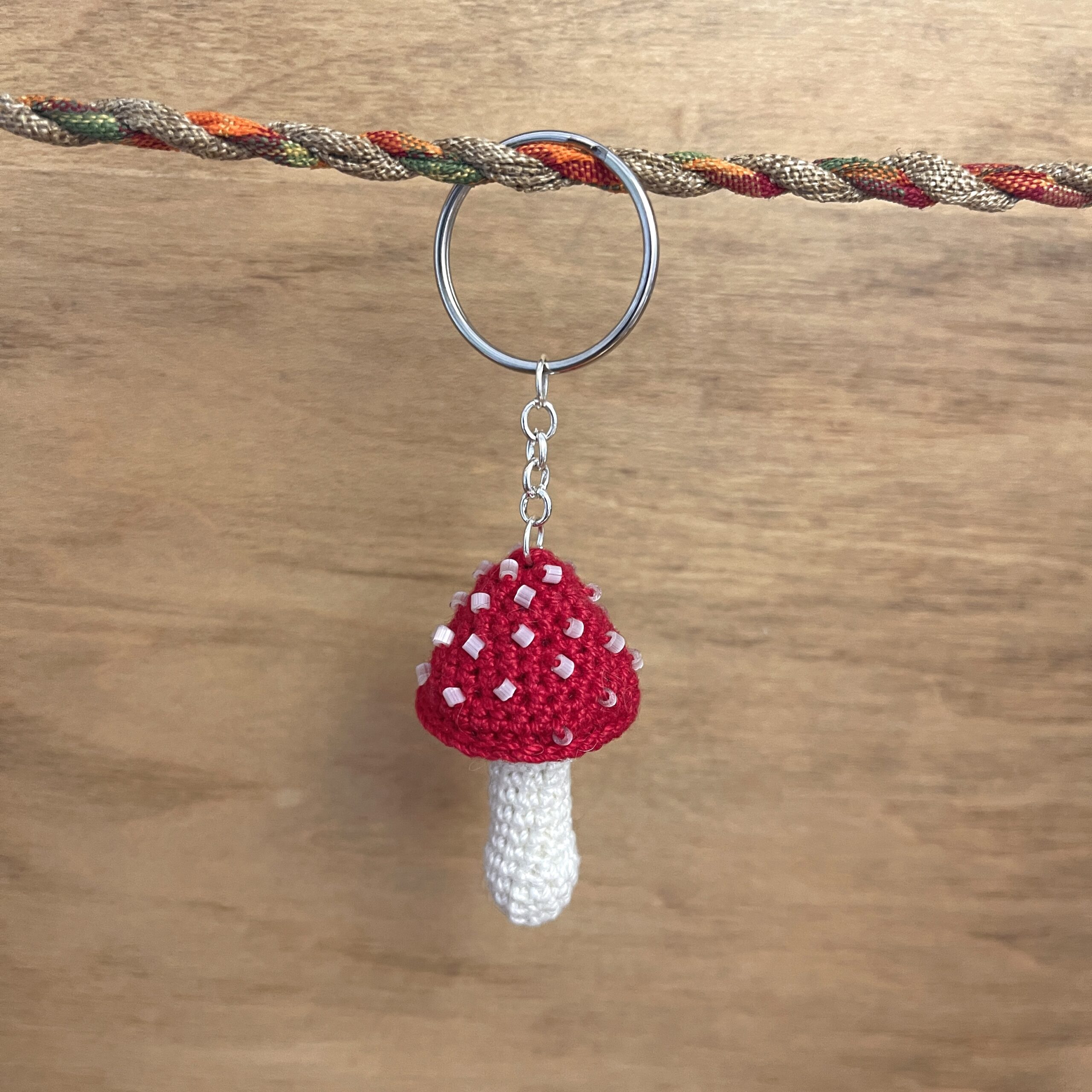 An adorable mushroom keychain with beaded spots! Handmade with 100% mercerized Egyptian cotton crochet thread, and includes a removable keychain ring.