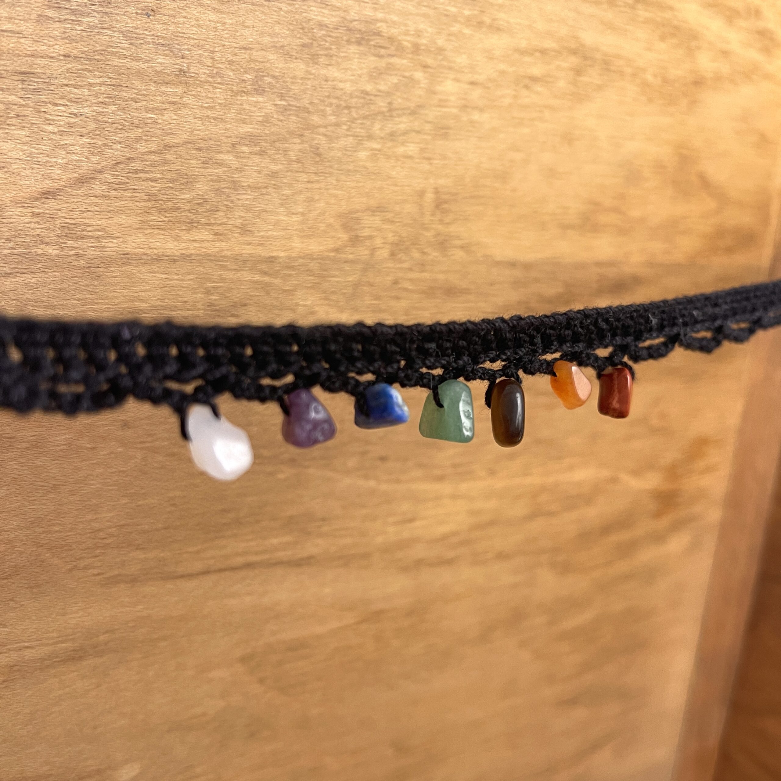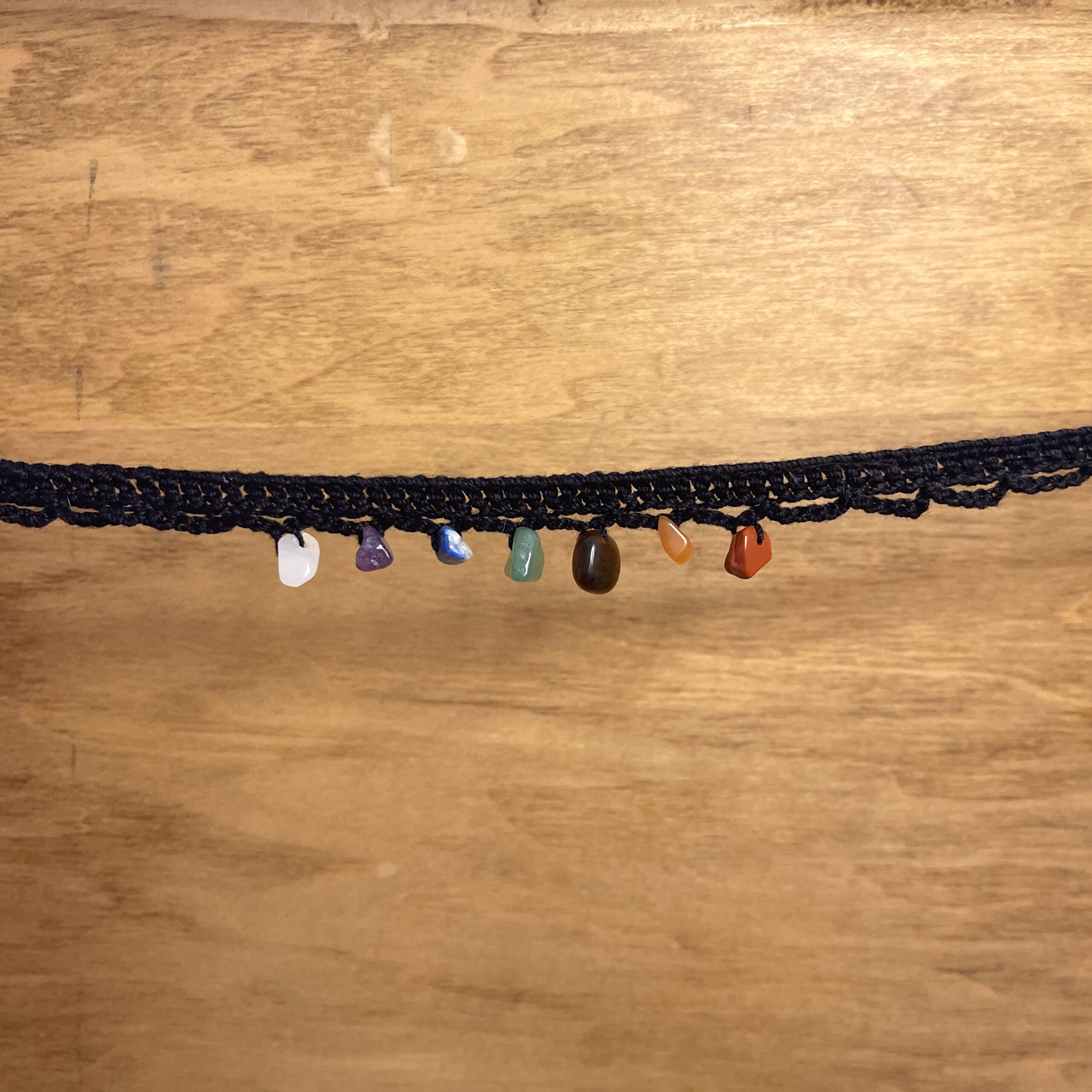- Adorned with the 7 chakra stones: quartz, amethyst, lapis lazuli, aventurine, tiger eye, carnelian, and red jasper