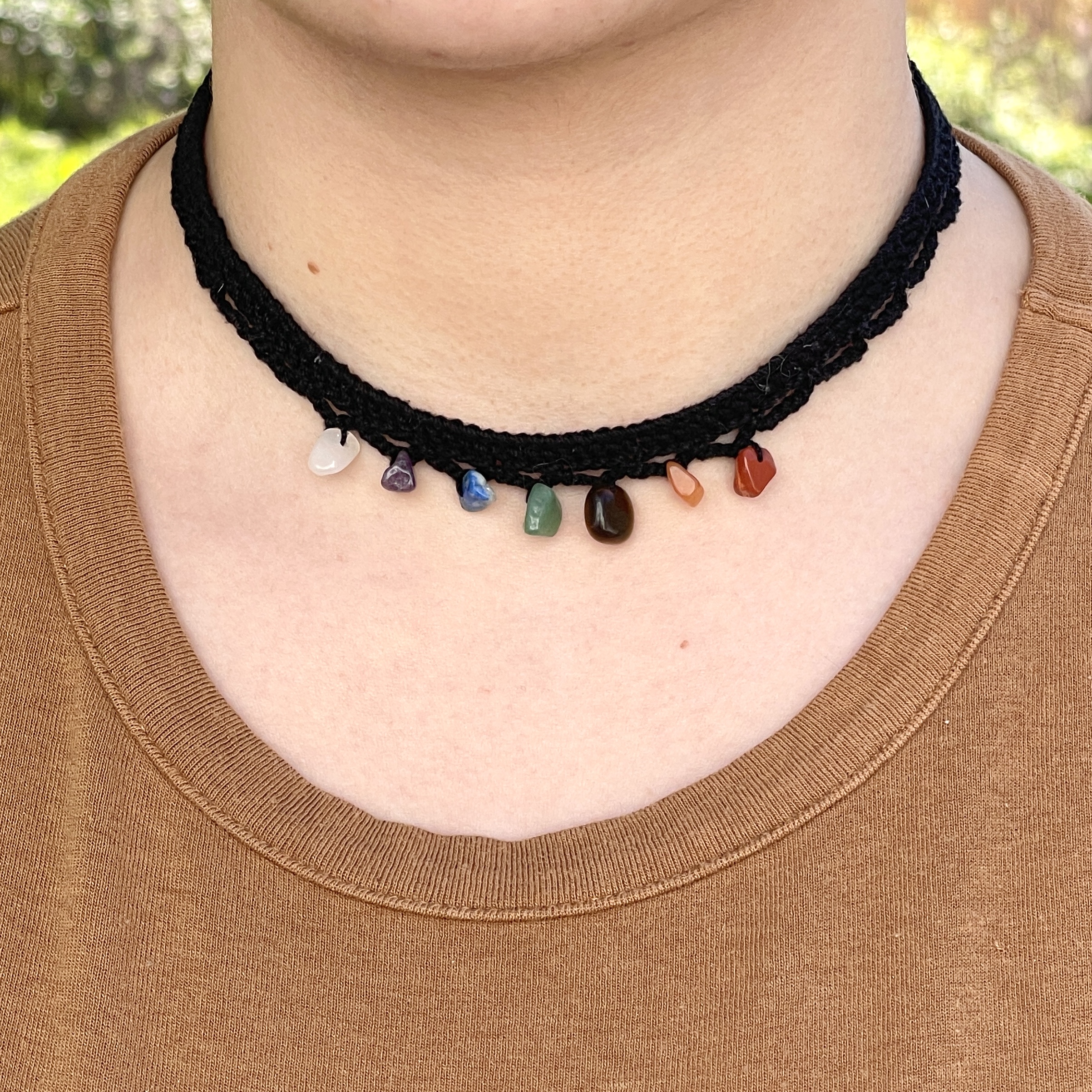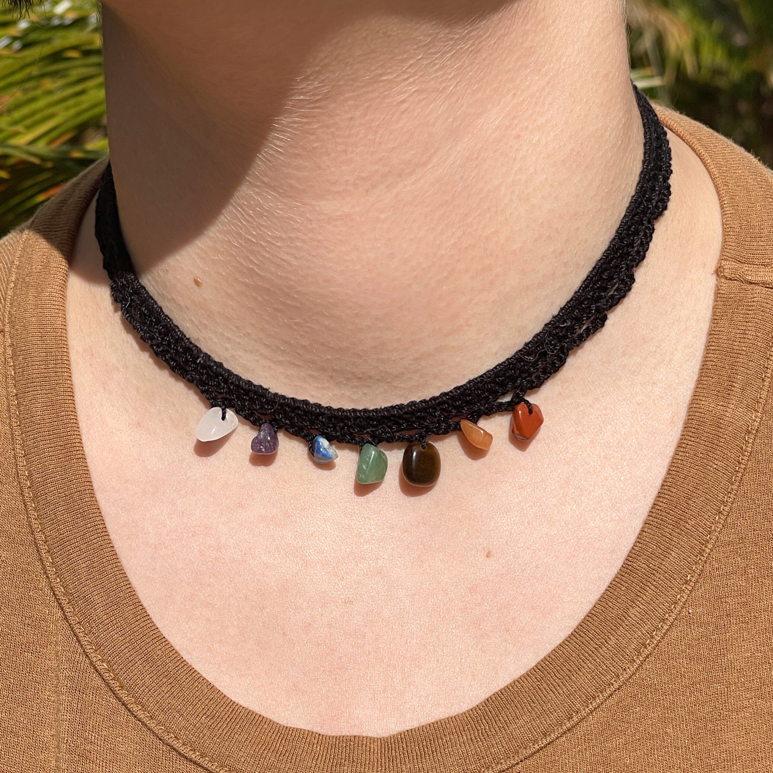 The chakra stone choker is a simple, stylish way to help align your chakras. The necklace is soft and delicate, and has a chain clasp that allows it to fit multiple neck sizes!