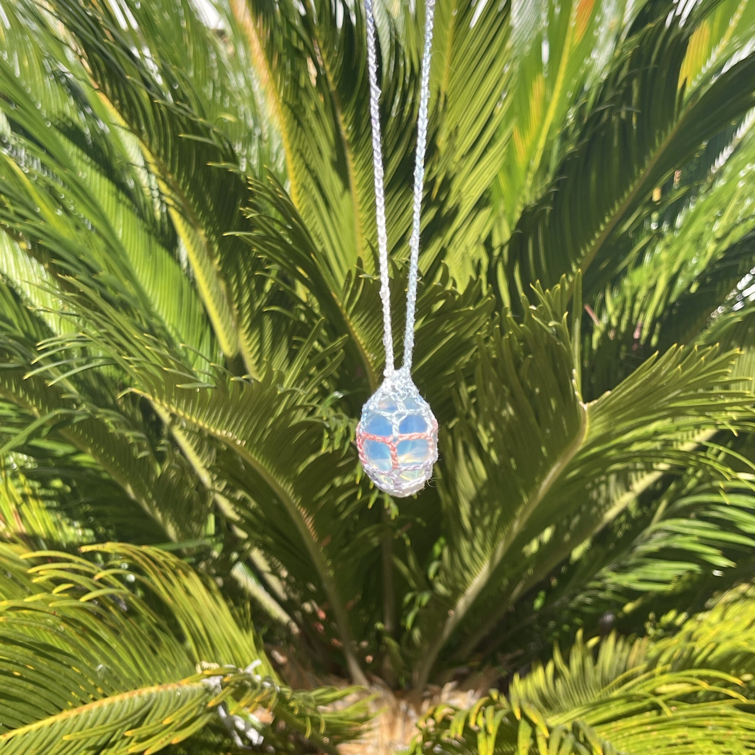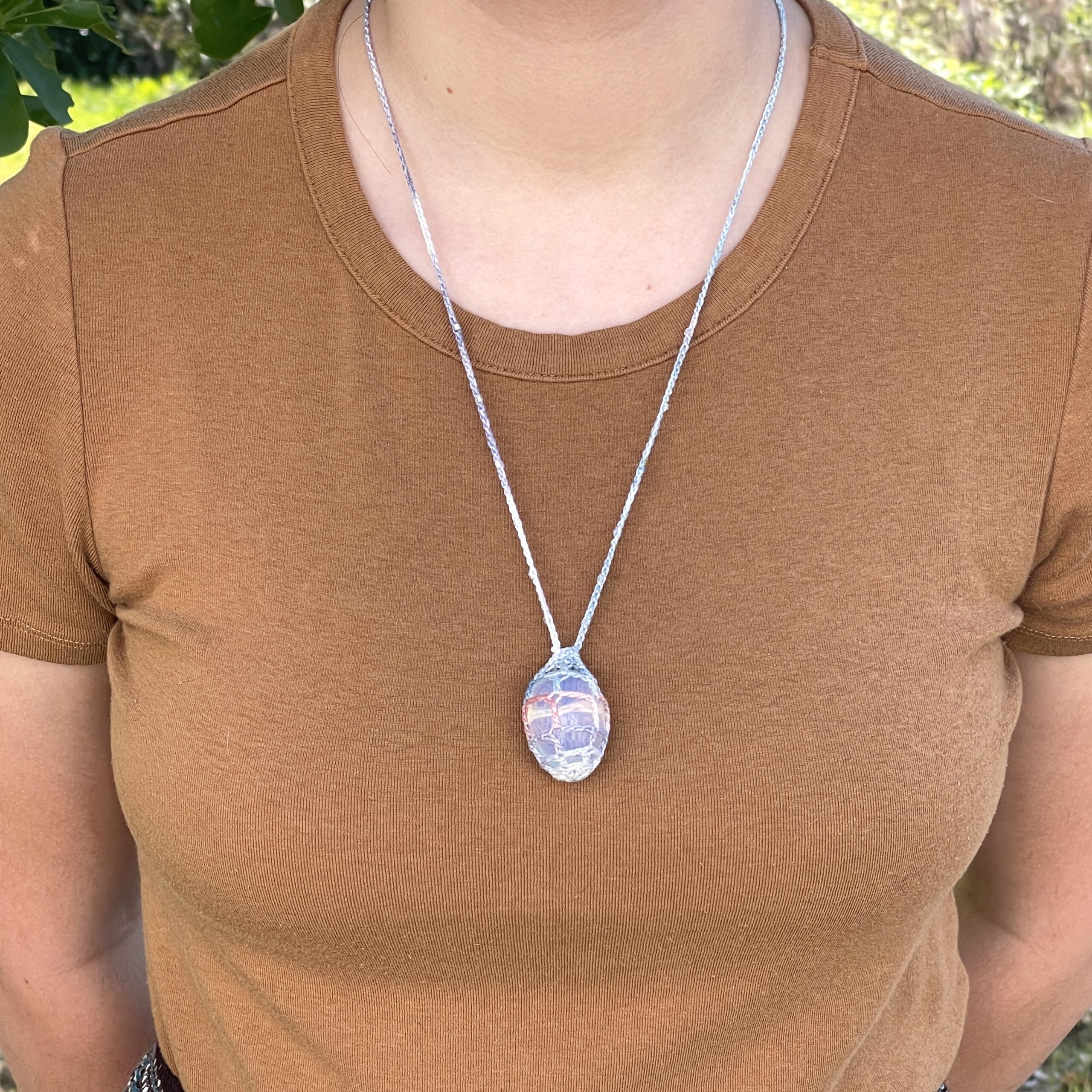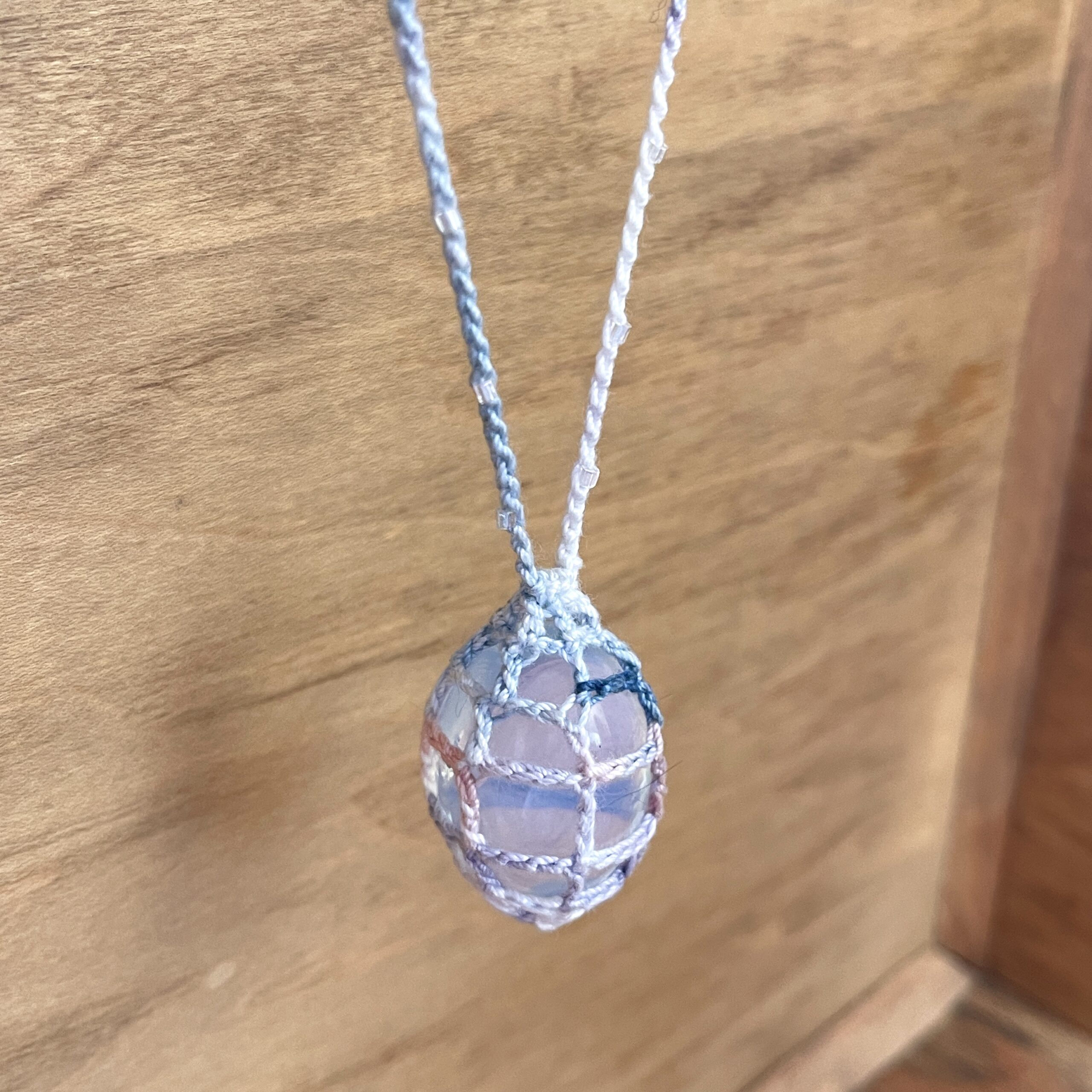 This necklace has an opalite crystal wrapped in hand dyed crochet thread, with tiny iridescent beads crocheted into the cord. I have tried to photograph the crystal in different lights, but as usual, the crystal looks even prettier in person and the camera does not do it justice.. NOTE: this is a single, one of a kind necklace, so once it’s gone, it’s gone for good!