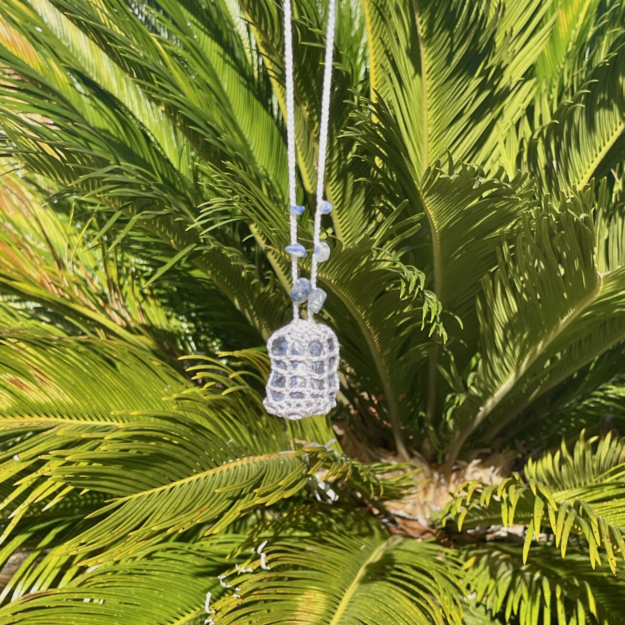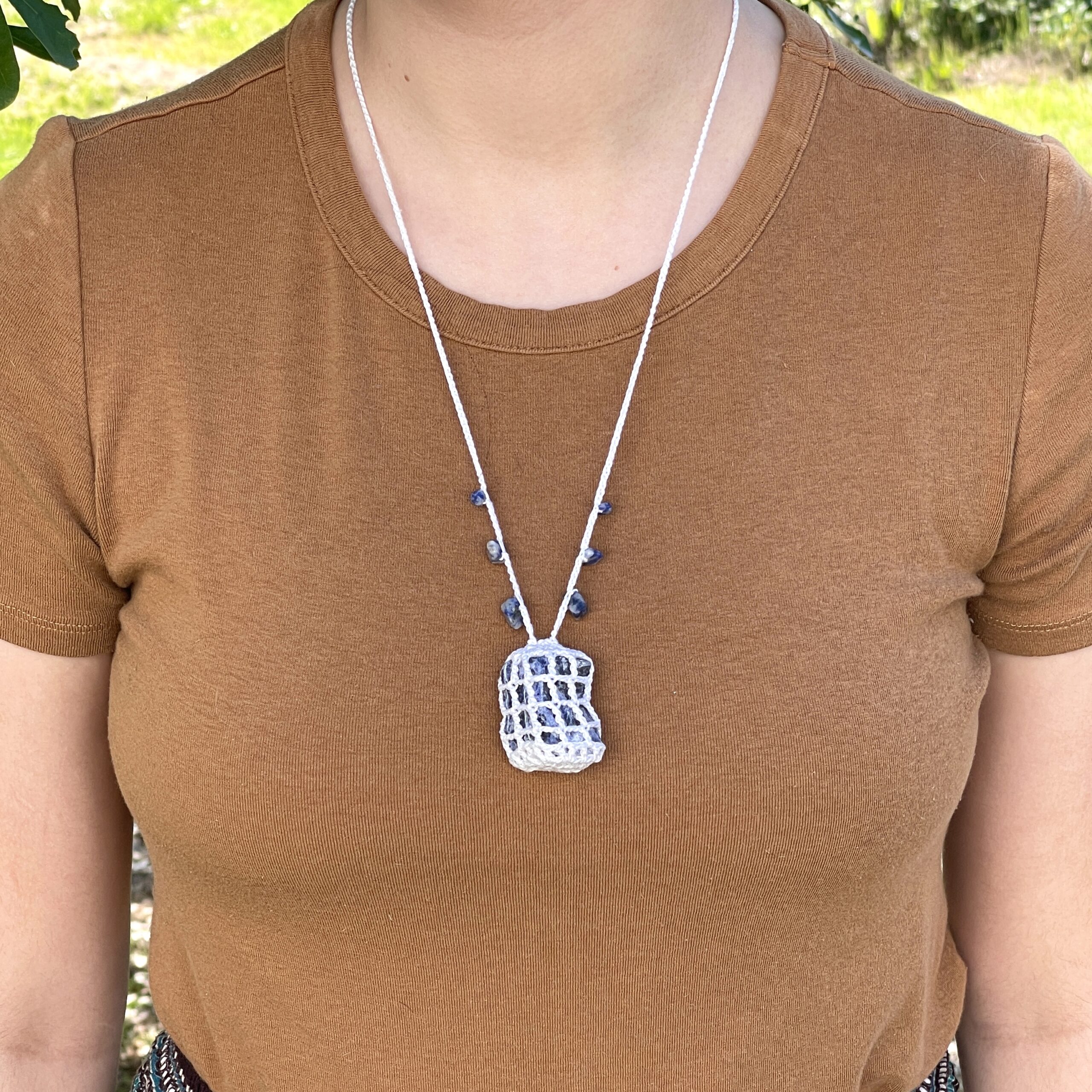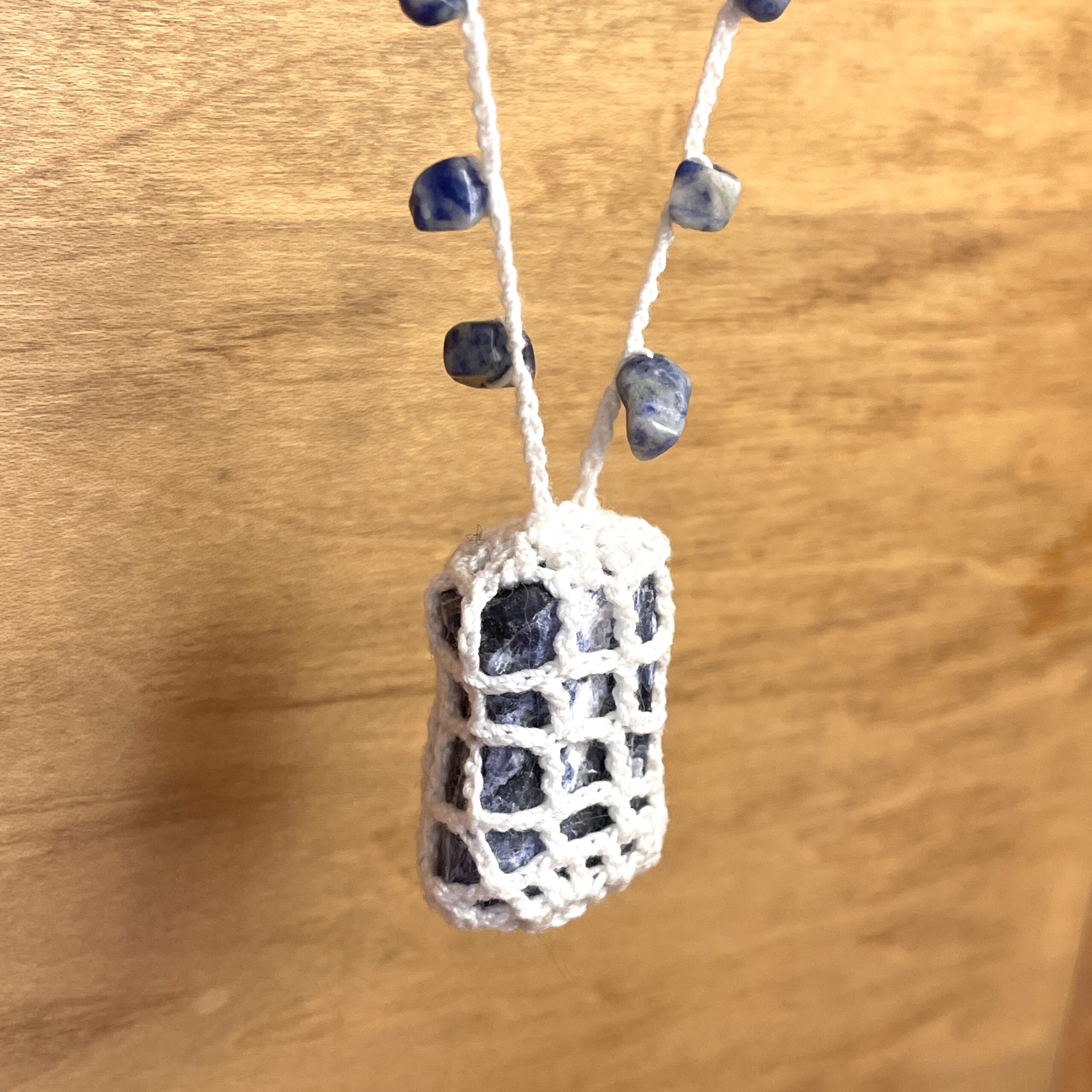 This necklace has a blue sodalite crystal wrapped in white crochet thread, with 6 matching beads crocheted into the cord. NOTE: this is a single, one of a kind necklace, so once it’s gone, it’s gone for good!