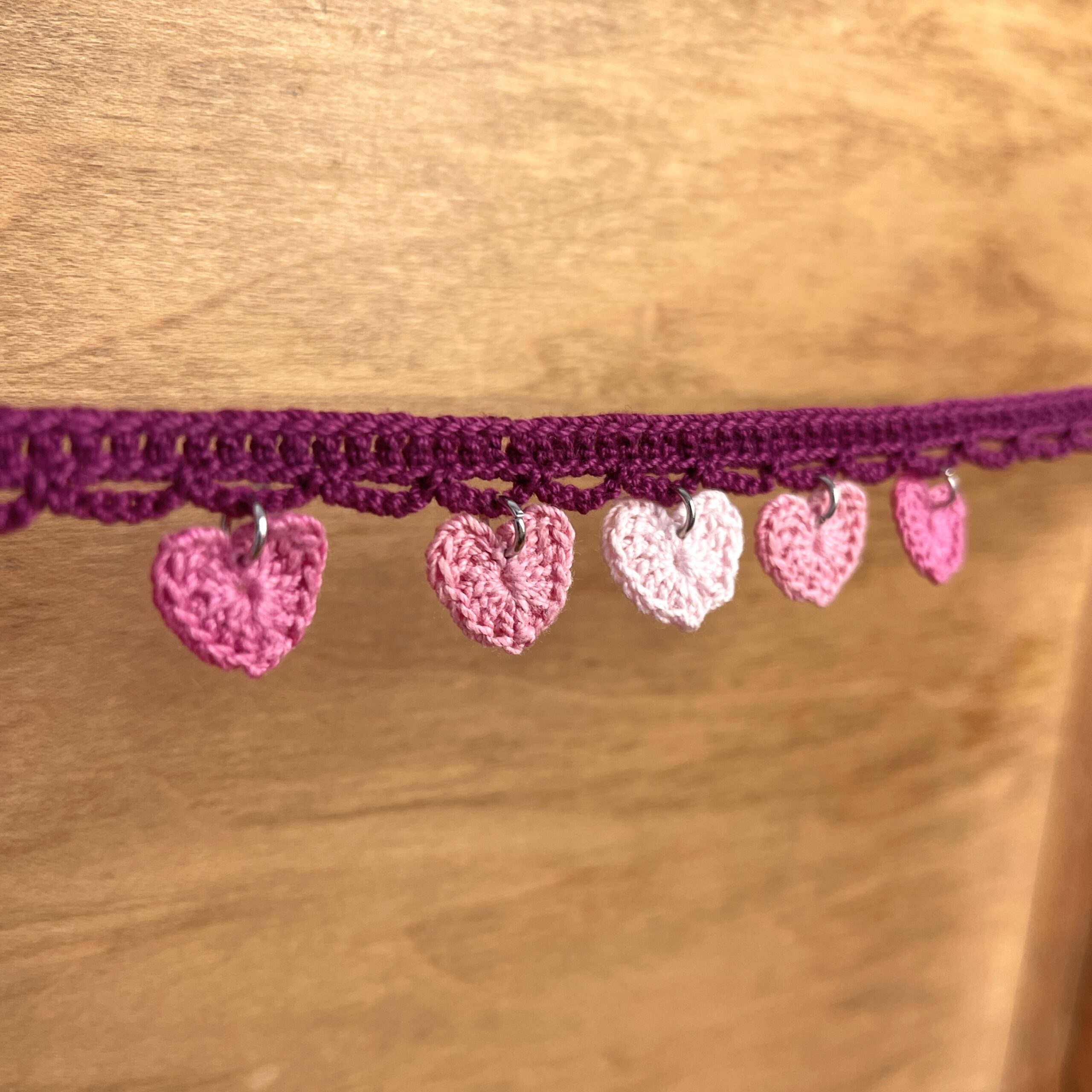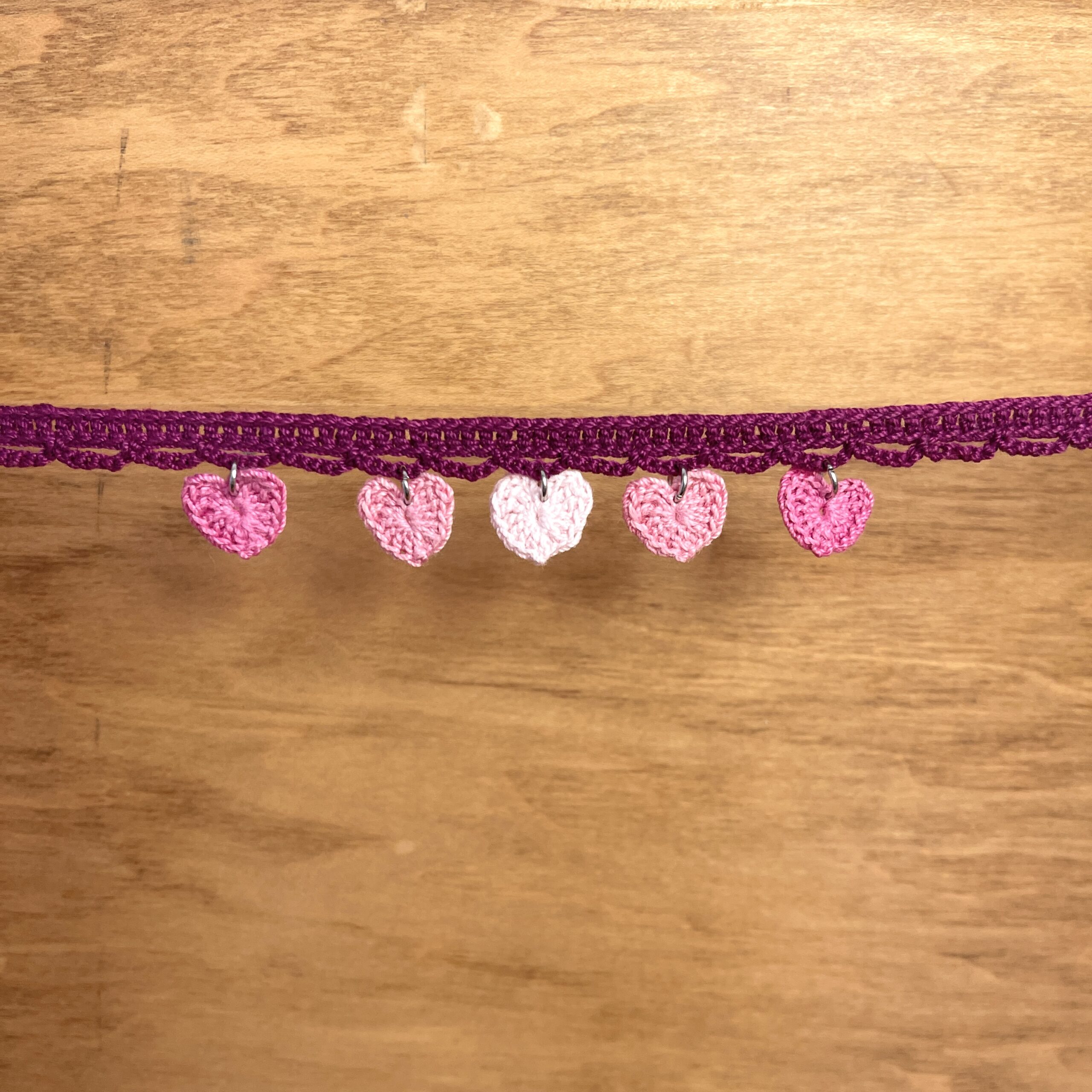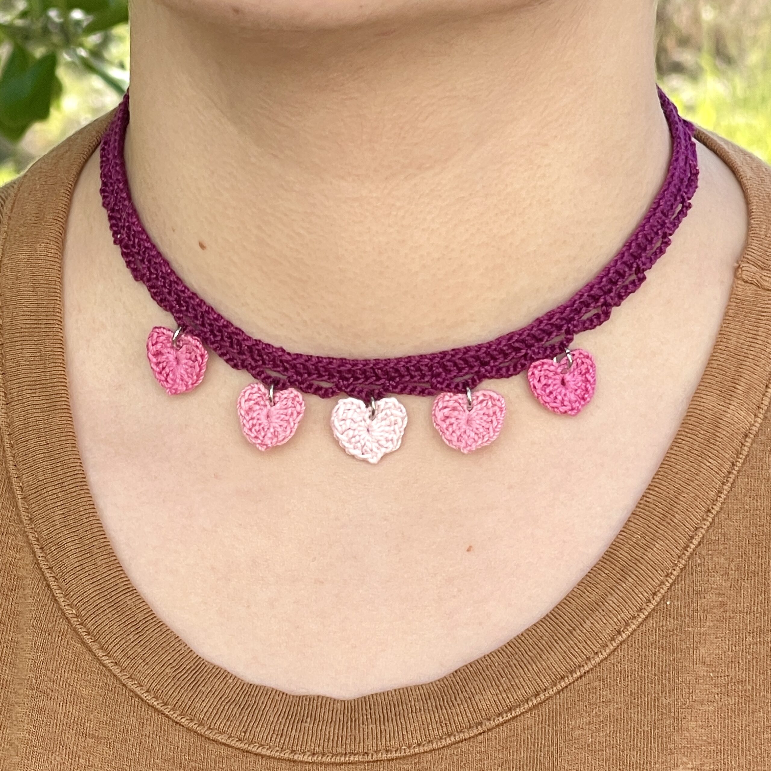 Crochet choker necklace with heart charms in different shades of pink, perfect for Valentine’s Day, or anytime you’re in a romantic mood. Features a 2 inch adjustable chain to fit multiple sizes! Made with 100% mercerized Egyptian cotton crochet thread. Hearts are treated with starch so they will keep their shape.